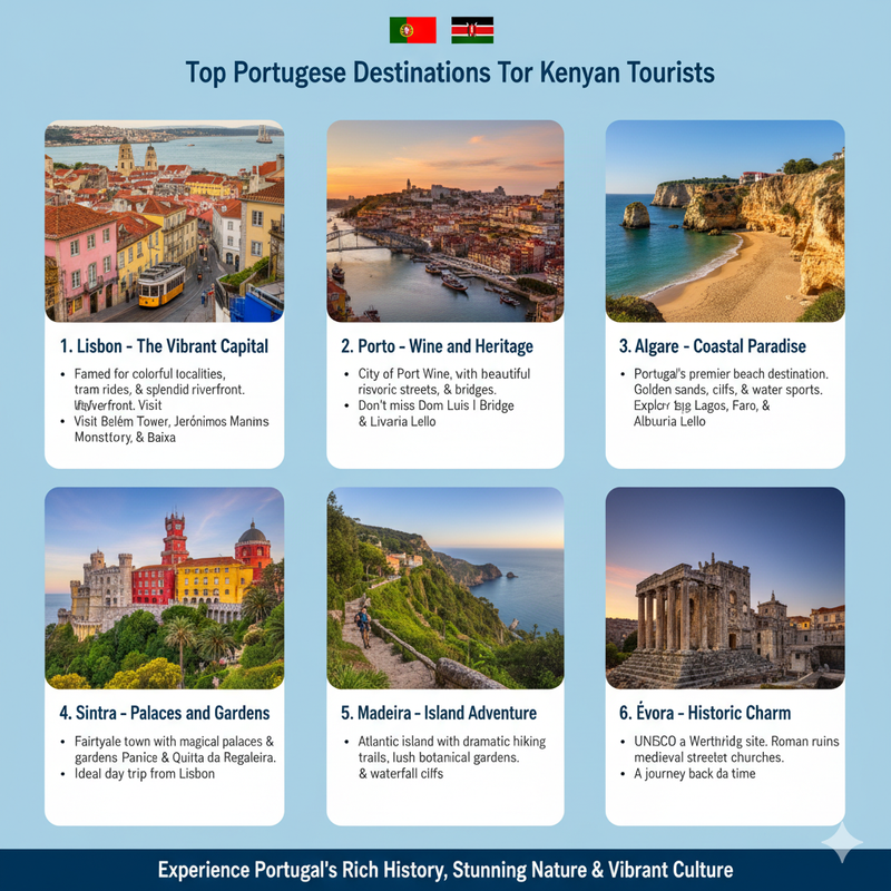 Portugal is a nation of contrasts – old cities and beautiful beaches. The following are the places that Kenyan tourists should be able to visit: